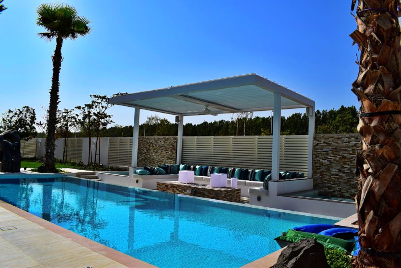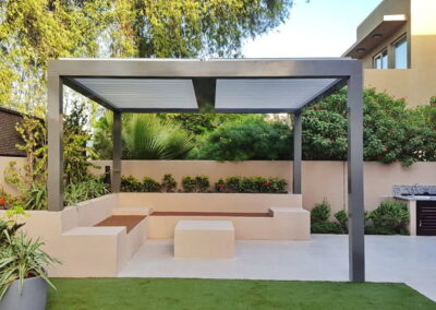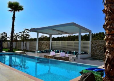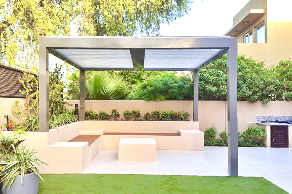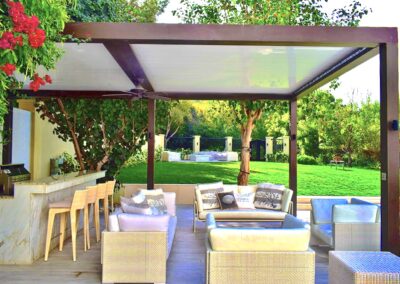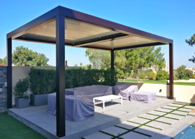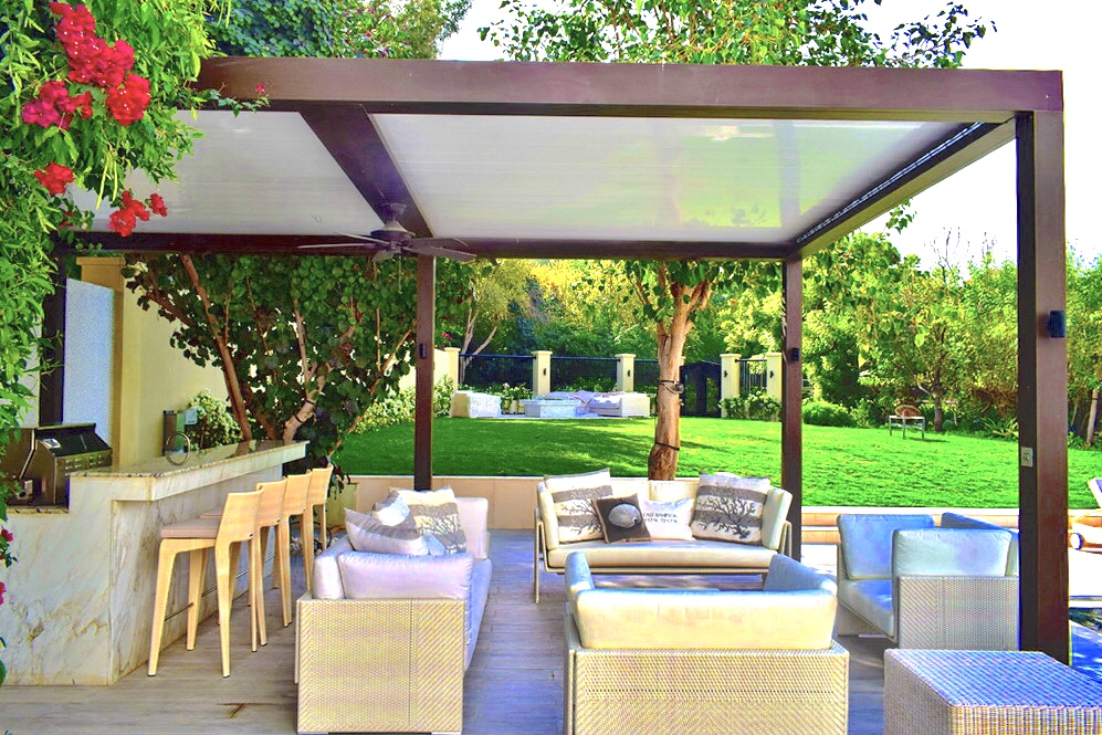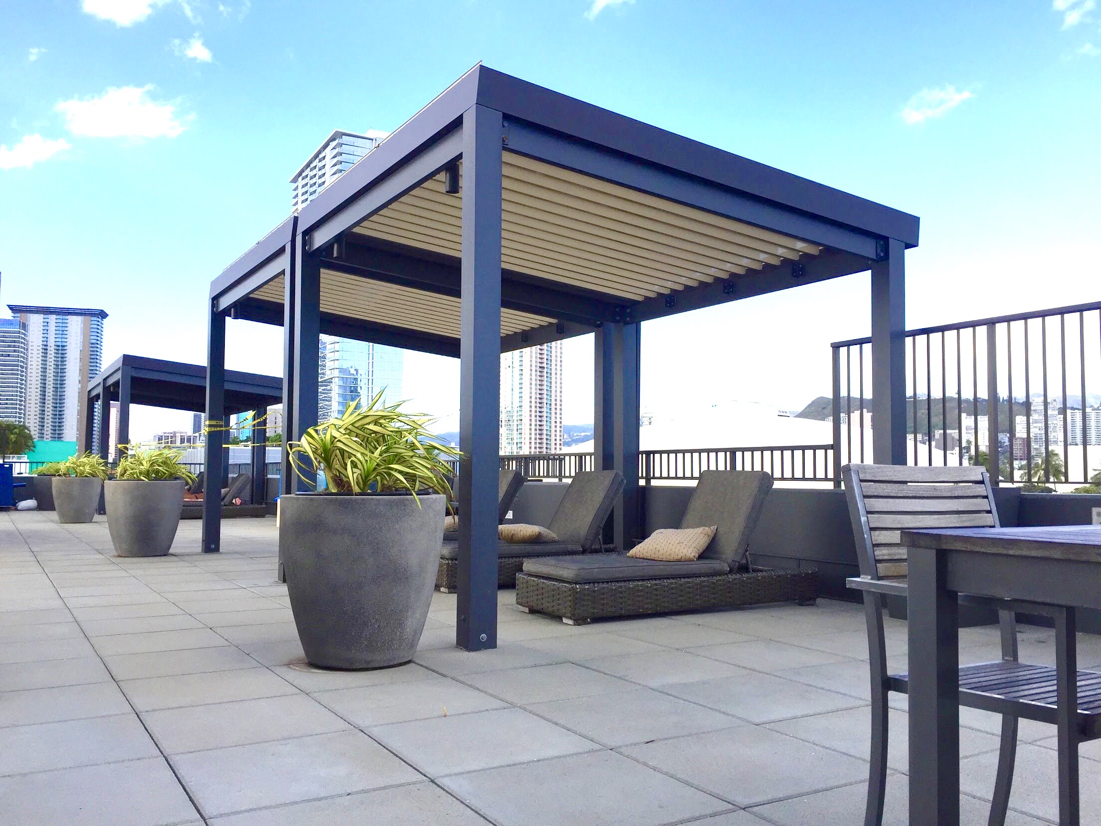 The most popular way to add style, shade, and protection from the elements. Motorized louvers on the roof open and close to give you the CHOICE of partial sun or complete shade with the push of a button, the roof slats can open or close.